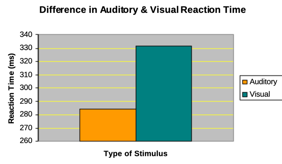 Auditiivisen ja visuaalisen reaktioajan vertailu. Lähde: Shelton and Kumar (2010)
